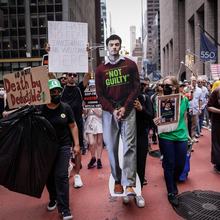 LÉGENDE : Une femme porte une affiche à l’effigie de Luigi Mangione à New York, le 19 avril 2024.